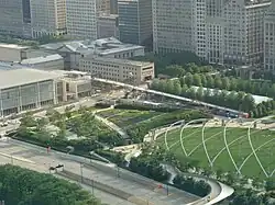 Millennium Park is considered one of the largest green roofs in the world, having been constructed on top of a railroad yard and large parking garages.[42] The park, which is known for being user friendly, has a very rigorous cleaning schedule with many areas being swept, wiped down or cleaned multiple times a day.[43][44] Although the park was unveiled in July 2004, some features opened earlier, and upgrades continued for some time afterwards.[45] Along with the cultural features above ground (described below) the park has its own 2218-space parking garage.[7]