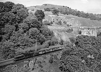To the west of the station, the line crossed the River Wye three times and ran through the 401 yards (367 m) and 94 yards (86 m) Chee Tunnels and the 121 yards (111 m) Rusher Hall tunnel, before reaching the New Mills line junction (officially Millers Dale Junction), 1.25 miles (2.01 km) from the station.[10]