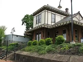 Built in 1898 by the Northern Central Railway, this historic structure is a two-story, brick and frame building that was designed in the Queen Anne style. It features a deep porch that wraps around three sides of the building. The property also includes the stone foundation of the original baggage house. This building was used as a passenger station until 1960.