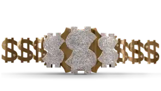 The Million Dollar Championship belt was designed by Terry Betteridge of Betteridge Jewelers in Greenwich, Connecticut.[26] The center plate features three large dollar signs that are entirely filled with cubic zirconia, and there are three small diamonds on the back. The strap itself is made up of multiple metal dollar signs that go around the entire circumference of the strap; there are small hinges between each dollar sign so that the strap can go around the title holder's waist. All of the metal on the belt is gold plated. Although the belt was billed as being worth US$1,000,000, DiBiase claimed the cost was around $40,000,[27] while Bruce Prichard claimed the cost was close to $50,000 during an episode of his podcast, Something to Wrestle with Bruce Prichard.[28]