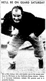 Sukup was the running guard and blocker for three backs who were later inducted into the College Football Hall of Fame: Tom Harmon, Forest Evashevski and Bob Westfall. During Harmon's Heisman Trophy-winning season, he publicly praised Sukup and fellow guard Ralph Fritz as "two big reasons for Harmon."[9] While taking no credit away from Harmon, Michigan's head coach Fritz Crisler noted that "Harmon gets exceptional blocking" from Evashevsi, Fritz and Sukup.[10] Walter L. Johns, sports editor of the Central Press Association, called Fritz and Sukup "two husky boys who could make any college team in the country."[11]