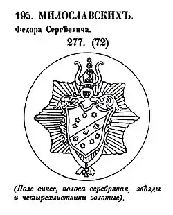 The coat-of-arms of the Miloslavsky family is described in the Armorial by Anisim Kniazev (1785).[5] The image is based on the seal of vice-admiral Fyodor Sergeevich Miloslavsky (d. 1783). On the blue shield, there is a silver diagonal stripe with three golden quatrefoils. In the upper section there are four golden six-pointed stars, while in the lower part there are three golden six-pointed stars. The stars are placed in arced lines. Over the shield there is the barred knight's helmet with the crown of nobility. The crest is two horns and three roses on top of one another crowned with a quatrefoil. Beneath the shield there is a templar cross on a ribbon.
