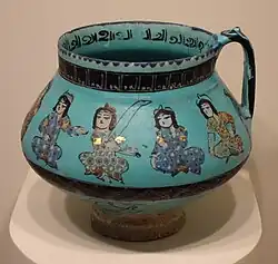 Mina'i ware is a type of Persian pottery, or Islamic pottery, developed in Kashan in the decades leading up to the Mongol invasion of Persia and Mesopotamia in 1219, after which production ceased.[2] It has been described as "probably the most luxurious of all types of ceramic ware produced in the eastern Islamic lands during the medieval period".[3] The ceramic body of white-ish fritware or stonepaste is fully decorated with detailed paintings using several colours, usually including figures.[4]