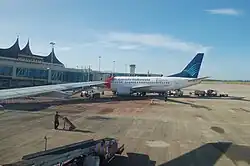 Minangkabau International Airport (IATA: PDG, ICAO: WIEE) is an airport serving the province of West Sumatra on the island of Sumatra, Indonesia. It is located at Ketaping, Padang Pariaman Regency which is about 23 km north-west of Padang city center. The airport commenced operations in July 2005 and took over the role previously held by Tabing Airport in Padang, which now serves exclusively as a military airbase for the Indonesian Air Force. The former airport could not be expanded due to limited land availability and had become increasingly congested as passenger numbers grew, leading to the decision to construct a new facility. The airport is named after the Minangkabau ethnic group, the indigenous population of the region. It functions as the main gateway to Padang and West Sumatra, with domestic connections to major cities in western Indonesia such as Jakarta, Pekanbaru, and Medan, as well as international flights to Malaysia and Singapore.