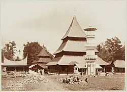 The traditional house of the Minangkabau people, is called Rumah Gadang. The rumah Gadang is usually built on a plot of land belonging to the parent family in the tribe and people from generation to generation.[7] Not far from the rumah gadang complex is usually also built a surau that functions as a place of worship and a place of residence for unmarried adult men. The rumah gadang is made in the form of a rectangle and is divided into two front and rear parts, generally made of wood, and at first glance it looks like a stilt house with a distinctive roof, prominent like a buffalo horn, the local people call it Gonjong and the roof was formerly made from palm fiber before changing to a zinc roof.[8] This rumah Bagonjong according to the local community was inspired by the Tambo, which tells of the arrival of their ancestors by boat from the sea. Another distinctive feature of this traditional house is not using iron nails but using wooden pegs, but strong enough as a binder.[9][10]
