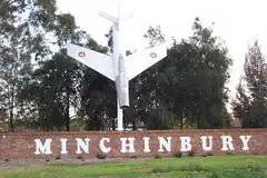 - A facsimile of the original CAC Avon Sabre jet aircraft (that had been installed at the entrance to the winery in 1955 with the accompanying sign "Don't Crash, Drink Penfolds") is mounted about 10 m off the ground, in a nearly vertical manner, at the intersection of the Great Western Highway and Minchin Drive (adjacent to Minchinbury Reserve). The original plane was placed there by Penfolds in the 1930s when they acquired it from Cliff Carpenter, who built it but only flew it once. It was originally crashed nose into the ground with the sign painted on the underside of the wings.[6]