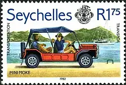 In 1982 the Seychelles issued a commemorative "Transportation" postage stamp featuring the Mini Moke.