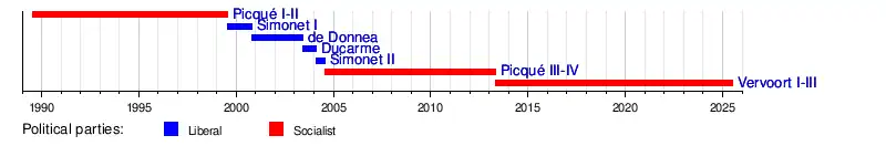 7 May 2013 | Incumbent | 12 years, 102 days | PS | Vervoort I | Open VLD, CD&V, Groen | PS, Ecolo, cdH |