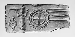 Very interesting objects are shown on the front of Plate Α, as recognised by Arthur Evans, who described them in his book The Palace of Minos at Knossos in 1921. On pages 478 and 479, he compares the base of an ivory object, of the Knossos board game, with the geared object on the mould of Palaikastro.[4] On page 514 he shows drawings of the objects left and right of the female figurine of Plate Α, however, not very precisely.[5] Evans refers to the isosceles cross being used in many cultures as the most simple representation of a star, and concludes that the geared object is a combination of a Morning Star with the disc of the sun. He interprets that the smaller object is a symbol for the goddess as the queen of the underworld and as the stars of the night. In combination with the crescent, the cross is then an Evening Star.[6]