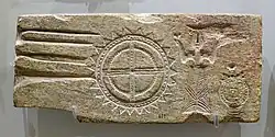 The Minoan Moulds of Palaikastro (Greek: Μήτρες του Παλαιοκάστρου Σητείας, romanized: Mitres tou Palaiokastrou Sitias) are two double-sided pieces of schist, formed in the Minoan period as casting moulds for plaques with figures and symbols. These include female figures with raised arms, labrys double axes (Λάβρυες, labryes) and opium poppy flowers or capsules, two double axes with indented edges, the Horns of Consecration symbol, and a sun-like disc with complex markings, which has been claimed by some researchers to be for making objects to use in astronomical predictions of solar and lunar eclipses.