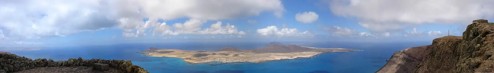After entering the building through a winding corridor, there are two spacious vaulted rooms with two large glass windows—the eyes of the Mirador—that provide a panoramic view over the Strait of El Río towards the island of La Graciosa. Also, on clear days, beyond the view of La Graciosa, the small islands of Montaña Clara and Roque del Oeste can be seen, with the furthest of them all being Alegranza.[4] All of these are part of the Chinijo Archipelago.[3][1]
