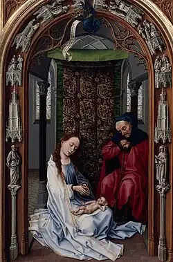 Each panel is framed by an arch or doorway and seems to be positioned within church portals, in interior spaces that give the appearance of taking place on a stage. The front of each frame contains the facing of a step, which, according to art historian Jeffrey Chipps Smith, implies "the viewer's proximity to, and potential for imaginatively entering into, the divine stage."[9] In contrast to most triptychs of the time, the panels were originally fixed and not hinged, although they were later broken apart and reassembled as movable.[10] Each is remarkably free of the pictorial traditions generally used when depicting these episodes. The Holy Family panel shows none of the other figures usually represented in pictures of the birth or infancy of Christ. Many of the elements are van der Weyden's own inventions; for example, the winding path in the right panel does not refer to any previous representation or biblical text. It is a temporal device to link the resurrected Christ with the figure who appears before Mary.[11][12]