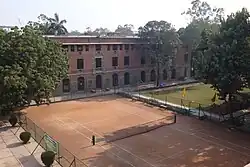 Miranda House was founded in 1948 by the university vice-chancellor, Sir Maurice Gwyer.[7] In a magazine published by him in 1952, he gave three reasons for why the college was called Miranda.[8] His favorite actress was Carmen Miranda, his daughter's name was Miranda, and a character named Miranda in William Shakespeare’s play The Tempest was, according to him, a perfect example of what a lady should be. Its foundation stone was laid by Lady Edwina Mountbatten on 7 March of the same year. Miranda House is built of red bricks on the university campus. Its original design was planned by the architect Walter Sykes George and is architecturally similar to other educational institutions in India founded in the colonial era. As the college grew, several buildings were added.
