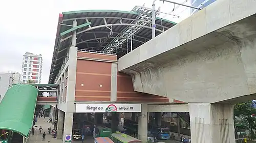 Mirpur 10 (Bengali: মিরপুর ১০, romanised: Mirpur dosh) is an elevated metro station of the Dhaka Metro's MRT Line 6. This station is located next to Fire Service in Mirpur 10, a neighbourhood of Dhaka, Bangladesh. The station was opened on 1 March 2023.[2][3][4]