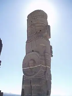 Tikal Stela 31 includes mirror imagery in the Teotihuacan warrior garb of king Yax Nuun Ayiin depicted on its sides.[65] Here the king wears a back mirror; the left hand side of the stela displays the face of the mirror and its rim while the right hand side shows the back of the mirror with lines near the edge of the mirror's disk that probably represent cord threaded through drilled holes to bind it to the king's costume.[51] This stela was erected in AD 445.[66] A back mirror is represented on Late Classic Stela 11 from Yaxchilan on the Mexican bank of the Usumacinta River. In this representation the mirror has a central spool with attached tassel similar to Early Classic mirrors and their representations from Teotihuacan and Kaminaljuyu.[54] Acanceh is an Early Classic Maya site in Yucatán that also displays the influence of Teotihuacan.[67] Five stucco figures at the site wear back mirrors in the Teotihuacan style.[51]