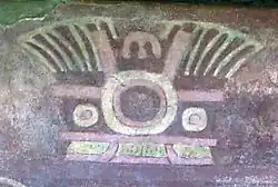 Mirrors had a great many symbolic associations at Teotihuacan; they could represent human eyes, faces, caves, passageways, spider webs, flowers, shields, the sun, a fiery hearth or the world as a whole.[20] The association of the human eye with mirrors was so strong that stylised eyes were frequently used in Teotihuacan art as a substitute for the face of a mirror. Mirrors could also be replaced by an entire face, rather than just an eye, reflecting widespread practice in Mesoamerica.[56] Sometimes mirrors were fashioned so the rim resembled petals of a flower, with the mirror face the centre. In art, representations of butterflies were sometimes positioned as if they were feeding from the mirror-flower. Sometimes metaphors could be combined in imagery, so that the mirror-flower was worked in such a way as to also resemble a face. Both flowers and butterflies were associated with fire at Teotihuacan,[12] with butterflies symbolising flames. At the same time, the face of the mirror symbolised fire. One mirror in the Teotihuacan style has a representation of a goddess on the back that is flanked by pairs of burning torches; fire signs cover her body.[57]