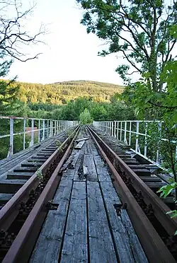 The first fieldwork began in March 1908. Due to challenging construction tasks (such as building the bridge over the Kwisa river and blasting rocks along the Kamienicki Ridge), the first phase of construction was completed on 1 October 1909 (the Mirsk–Świeradów-Zdrój section). The remaining section (to Świeradów Nadleśnictwo) was finished on 29 July 1910.[17] Regular operations on the Mirsk–Świeradów-Zdrój section began on 31 October 1909,[18] while the section to Świeradów Nadleśnictwo was put into regular use on 5 June 1910.[1][16][18] The newly constructed line was a narrow-gauge railway with a track gauge of 600 mm.[19]