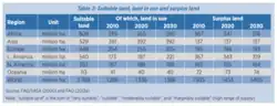 In general, yield expectations are lower for marginal land than for arable land in the same geographical area. Marginal land is land with issues that limits growth, for instance low water and nutrient storage capacity, high salinity, toxic elements, poor texture, shallow soil depth, poor drainage, low fertility, or steep terrain. Depending on how the term is defined, between 1.1 and 6.7 billion hectares of marginal land exists in the world.[ak] For comparison, Europe consists of roughly 1 billion hectares (10 million km2, or 3.9 million square miles), and Asia 4.5 billion hectares (45 million km2, or 17 million square miles). According to IRENA (International Renewable Energy Agency), 1.5 billion hectares of land is currently used for food production globally, while "[...] about 1.4 billion ha [hectares] additional land is suitable but unused to date and thus could be allocated for bioenergy supply in the future."[14] The IPCC estimates that there is between 0.32 and 1.4 billion hectares of marginal land suitable for bioenergy in the world.[al] The EU project MAGIC estimates that there is 45 million hectares (449 901 km2; comparable to Sweden in size) of marginal land suitable for Miscanthus × giganteus plantations in the European Union,[15] with three classes of expected yield (high: 30–40 t/ha/yr, medium: 20–30 t/ha/yr, and low: 0–20 t/ha/yr).[16]