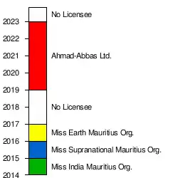 The license of Miss Grand Mauritius was transferred to the Miss Supranational Mauritius organizer, Miss Earth Mauritius pageant, and Ahmad-Abbas Ltd. in 2015, 2016, and 2019, respectively.[3][8][9] Still, most of the country representatives were appointed; no Miss Grand National was held,[2][3][9] the country representative was directly elected through the contest only in 2021 when the pageant named Ahmad-Abbas Pageant Show was organized to select the Mauritian candidate for Miss Grand International specifically.[10]
