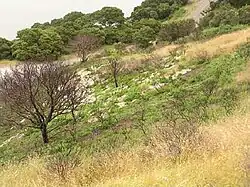 The area that was cut was seeded with native plants. Among them, purple needle grass, in fall 2004 and again in fall 2005 about one pound of purple needle grass seed was sowed directly on the burn site. 400 summer lupine seedlings were also planted, most were grown in nearby nurseries while some were collected in the Marin Headlands. Still, both plants are forced to compete with non-native Italian thistle and French broom.[16]