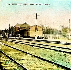 As the original county seat for Harrison County, Mississippi City was one of the most important towns on the Mississippi Gulf Coast in the latter half of the 19th century.[3] In 1869 and 1870, the Louisville and Nashville Railroad (L&NRR) was constructed through the southernmost section of Harrison County, connecting New Orleans, Louisiana, and Mobile, Alabama.[4] Mississippi City was situated on the L&NRR, approximately 71 miles (114 km) east of New Orleans. In 1900, the population of Mississippi City was 534 and increased to 800 by 1906. At that time, the town had both public and private schools, a courthouse, post office, hotels, and several churches. Because of the mild climate, the town's beach location on the Mississippi Sound attracted visitors throughout the year. Mississippi City served as the county seat of Harrison County from 1841 to 1902.[5]