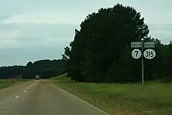 MS 315 begins at MS 9W and County Route 428 (CR 428) near the community of Paris in Lafayette County. The highway heads west (signed north) through a mix of woods and farmlands. It enters Yalobusha where it parallels the banks of Otoucalofa Creek. As the road approaches the city of Water Valley, the name of the road becomes Blackmur Drive as it heads through a residential neighborhood descending in elevation. In the downtown area, MS 315 turns onto Main Street to head south out of center of the city. It reaches MS 32 forming a brief concurrency to the west. MS 315 then reaches MS 7, a divided highway just outside the city limits. MS 315 heads north along MS 7, then curving to the northeast, briefly entering the city limits again, before MS 315 breaks off the concurrency from MS 7 to head northwest out of Yalobusha County. First, it reenters Lafayette County where it crosses the Yocona River and Enid Lake on a through truss bridge, then has an intersection with MS 328. Afterwards, MS 315 heads northwest and then north through woodlands in Panola County. MS 315 reaches a diamond interchange with US 278/MS 6 in a rural section of the county. The state highway officially continues past the interchange to end about 300 feet (91 m) past the interchange at John Branch Road and Marshall Road.[3]