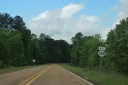 The route starts at the intersection of US 45 Alt. and MS 852 in Brooksville, and it travels east to US 45. The road leaves the city limits of Brooksville east of the intersection,[5] and it travels south-southeast to Pilgrims Rest Road, where it turns east towards Deerbrook.[6] The road crosses over Bogue Chitto and passes through Deerbrook. West of Cliftonville, MS 388 intersects the southern terminus of MS 792.[3] Continuing through rural Noxubee County, the route turns northeast at Stevenson Road. At Togo Road, MS 388 turns eastward. After turning northeast at Fox Chase Road west of Bigbee Valley, the road enters into a forest and turns southeast at Clayton Road. At the Alabama–Mississippi state line, MS 388 ends and SR 86 continues east to Pickensville.[6]