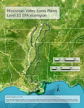 The North American Mississippi Valley Loess Plains are a Level III ecoregion designated by the Environmental Protection Agency (EPA) in six U.S. states. The region lies primarily on the eastern border of the Mississippi Alluvial Plain, from the Ohio River in western Kentucky, through Tennessee and Mississippi, to Louisiana. A separate unit that includes Crowley's Ridge occurs west of the river in Arkansas and Missouri.[1] It has been divided into four Level IV ecoregions.