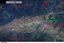Around 13,000 years ago, the entire valley was at the bottom of Glacial Lake Missoula. As could be expected for a former lake bottom, the layout of Missoula is relatively flat and surrounded by steep hills. Evidence of the city of Missoula's lake-bottom past can be seen in the form of ancient horizontal wave-cut shorelines on nearby Mount Sentinel and Mount Jumbo.[44] At the location of present-day University of Montana, the lake once had a depth of 950 feet (290 m).[45] The Clark Fork River enters the Missoula Valley from the east through Hellgate Canyon after joining the Blackfoot River 5 miles (8 km) east of downtown, at the site of the former Milltown Dam. The Bitterroot River and multiple smaller tributaries join the Clark Fork on the western edge of Missoula. The city also sits at the convergence of five mountain ranges: the Bitterroot Mountains, Sapphire Range, Garnet Range, Rattlesnake Mountains, and the Reservation Divide, and thus is often described as being the "hub of five valleys".[7]