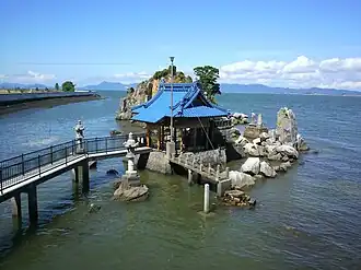 Mizushima (水島) is a small uninhabited coastal limestone island at the mouth of the Kuma River at the northern end of the Yatsushiro Sea in Yatsushiro, Kumamoto Prefecture, Japan. An episode in the Nihon Shoki explains how the isle gained its name: on the eleventh day of the fourth month of the eighteenth year of the reign of Emperor Keikō (AD 88), the Emperor, near the end of his tour of inspection of Tsukushi, laid anchor at the island and partook of food. When he then asked Ohidari (小左) for water to drink, he was at a loss, there being no ready source to hand; praying to the gods, a spring issued forth, which he drew and proffered to the Heavenly Sovereign; from this the isle takes its name of "water island".[1] The island also features in two poems by Prince Nagata (長田王) in the Man'yōshū (III.245 f.).[2][3][4] As a joint designation with the local atmospheric and optical phenomenon known as Shiranui, Mizushima is a nationally designated Place of Scenic Beauty.[5] It also forms part of the Japan Heritage "story" The Story of Masons who Developed Yatsushiro: Masonry Legacy in the Town of Masons.[6][7]