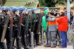 Long the only large force specialized in maintaining or restoring law and order during demonstrations or riots, the GRM progressively developed the doctrine and skills needed in that role: exercise restraint, avoid confrontation as long as possible, always leave an "exit door" for the crowd, etc.[3]