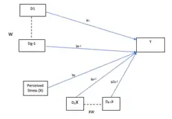 A statistical diagram that depicts a moderation model with W with three levels, as a multi-categorical independent variable.