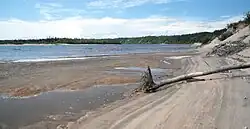 The proposed aquatic reserve is in the Grenville Province of the Canadian Shield, in the foothills of a mountain range formed almost 1,000 million years ago, with high and low hills, mounds and hummocks. The bedrock is mostly gneiss and paragneiss, with some marble upstream, and small pockets of anorthosite and charnockite downstream. The surface is covered by a thin layer of glacial till upstream.[6] Further down the surface is mostly covered in rock and peat. The bed of the Moisie river is composed of glaciofluvial sand and gravel. The highest elevation in the proposed reserve is 991 metres (3,251 ft), falling to 8 metres (26 ft) near the coast. The average elevation is 437 metres (1,434 ft).[6]