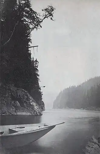 The Moisie river rises in Ménistouc lake at an elevation of 520 metres (1,710 ft) and flows south for 363 kilometres (226 mi) to the Saint Lawrence Estuary. Its drainage basin covers 19,196 square kilometres (7,412 sq mi). It has nine tributaries that drain more than 300 square kilometres (120 sq mi). The largest are the Aux Pékans River in the north, draining 3,419 square kilometres (1,320 sq mi), and Nipissis River in the south, draining 4,196 square kilometres (1,620 sq mi). The river drops on average 1.4 metres per kilometre (7.4 ft/mi), with sections of rapids and waterfalls, and discharges 401 cubic metres per second (14,200 cu ft/s) on average of exceptionally clean water. Along most of its length it runs through deep gorges.[6] The river flows through dramatic, unspoiled scenery and has not been dammed for hydroelectricity. It has great value as one of the last remaining examples of untamed rivers on the North Shore.[6]