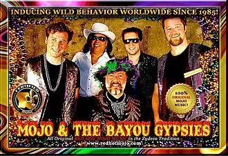 Mojo & The Bayou Gypsies is a band led by Mojo from Breaux Bridge Louisiana. Their music is a blend of zydeco, Cajun and their particular style which he calls Red Hot Mojo Music. Circa 2018, they consist of Mojo on vocals and Cajun accordion, Zydeco T Carrier on Frottoir, Greg Hirte on Cajun fiddle, Tee John Moser on drums, and Beau Brian Burke on bass.