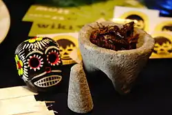 A molcajete (Spanish: [molkaˈxete]; Mexican Spanish, from Nahuatl molcaxitl) and tejolote (from Nahuatl texolotl) are stone tools, the traditional Central American and especially, the Mexican version of the mortar and pestle used for grinding various food products.[1]