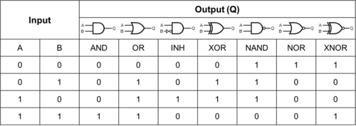 AND, OR, XOR, NAND, NOR, XNOR, and INH are two-input logic gates. The AND, OR, and XOR gates are fundamental logic gates, and the NAND, NOR, and XNOR gates are complementary to AND, OR, and XOR gates, respectively. An INHIBIT (INH) gate is a special conditional logic gate that includes a prohibitory input. When the prohibitory input is absent, the output produced depends solely on the other input.