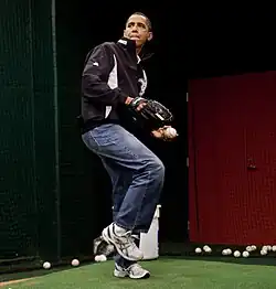 A corresponding term, dad jeans, has been coined in popular media to refer to high-waisted jeans often worn by middle-aged American men. The term gained popularity in 2009 when President Barack Obama wore high-waisted jeans during the 2009 Major League Baseball All-Star Game.[4][5][6][7] In March 2015, Obama appeared on Jimmy Kimmel Live! for the "Mean Tweets" segment, in which he read a tweet mocking him over the jeans. Jimmy Kimmel then appeared on stage wearing high-waisted jeans, and jokingly attempted to defend them.[8]