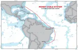 The MONET cable system is a subsea fibre optic telecommunications cable completed in December 2017.[2] Final splicing occurred in November 2016. Monet connects the cities of Praia Grande and Fortaleza in Brazil with Boca Raton in the United States.[1][2]