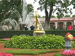 The garden was laid out according to a sketch of Peter the Great during 1714-1716.[2] The layout of the garden consists of four flower stalls (with a total area of 30x32 m), separated by crossing alleys. The main decorations of the garden are its fountains. The largest one is The Sheaf, in the center of the garden composition. It has a major main jet and twenty-four small inclined jets. This fountain marks the central point of the entire composition.[2]
