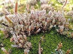 Montitega dealbata is a dense mat-forming plant native to Tasmania and New Zealand. The whitish underside of the 3–5mm long and 1–2mm wide leaves distinguish this species from the similar alpine plant Pentachondra pumila.[4][5]