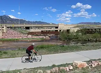Monument Creek flows through the approximately 2 miles (3.2 km) long Monument Valley Park at the western edge of downtown Colorado Springs. The creek runs through the center of the park from West Monroe south to West Bijou.[7] Within the park, Monument Creek flows north to south and falls about 72 feet (22 m) in elevation. It is 5,988 feet (1,825 m) in elevation at its lowest point at the southwestern corner of the park; It is 6,060 feet (1,850 m) in elevation at the northern edge of the park, north of Boddington Field. The narrow Mesa Creek intersects with Monument Creek at the northwestern edge of the park.[7]