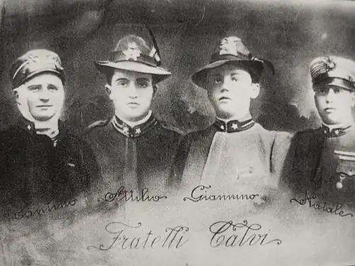 The Monument to the Brothers Calvi is a monument located in Piazza Matteotti in front of Palazzo Frizzoni (now the city hall) in the lower town of Bergamo, in the region of Lombardy, Italy. It commemorates the four brothers who served as Alpini or mountain infantry, who died during or shortly after the First World War. In the decades after the war, the brothers were revered for their exemplary martyrdom for the Italian nation.
