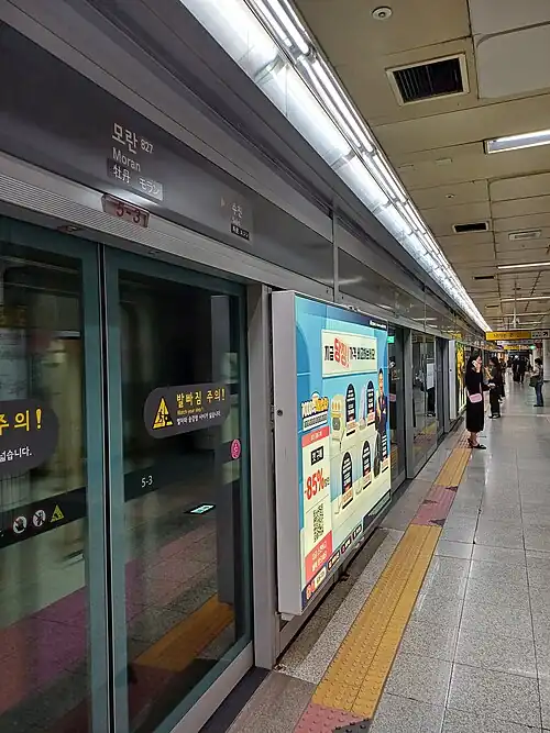 Moran Station serves as the southern terminal of Seoul Subway Line 8 and is also a stop on the Suin–Bundang Line.[1] The Moran Market is held near the station during the 4th and 9th days of the month.