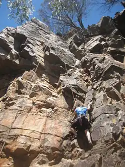Being only 10 km from the centre of Adelaide and having a large number of climbs, Morialta is one of the most popular rock climbing areas in South Australia.[17] The rock is quartzite, and there are heavy duty rings at the top of most routes to allow for easy top-roping.[18]