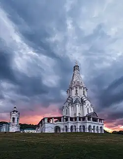 Daniel's descendants struggled with the princes of Tver for succession to the grand principality.[47] Yury won recognition from the Mongol khan as the grand prince in 1318, but he lost the title four years later.[48] Ivan I recovered the grand princely throne from Tver after proving himself to be a loyal servant of the khan.[49] Ivan collected the tribute to the khan of the Golden Horde from dependent Russian princes and he used the funds he acquired to develop Moscow.[50] The metropolitan of the Russian Church also found an ally in Ivan and moved his seat from the nominal capital of Vladimir to Moscow.[51][50] The foundation of Moscow's first stone church, the Dormition Cathedral, was laid in 1326, and the metropolitan chose to be buried there – an act that would cement Moscow's status as the spiritual center of Russian Orthodoxy.[51] Masonry building continued in the following years with the construction of additional stone churches.[52] The limestone walls and towers of the Kremlin were built in 1366–1368.[52] A distinct architectural school emerged in the late 14th century.[52]