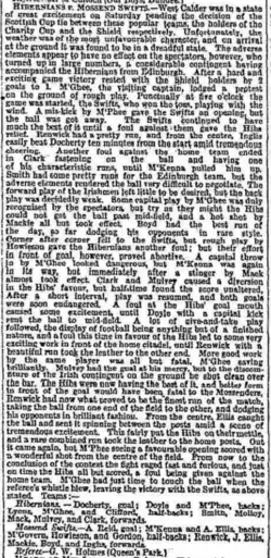 The club's best run in the national competition came in 1888–89, reaching the final 16; in the first round the Swifts caused a major shock by defeating Hibernian 2–1at Mossend Park in front of a crowd of 2,000.[8] The club was eliminated in the fifth round at Dumbarton; the club was unlucky as the original tie was declared a friendly because of a waterlogged pitch, and, as the Swifts had drawn 1–1 (albeit in a match of one hour's duration),[9] it lost the potential to host the replay. The Swifts protested its defeat in the re-played tie on the grounds of roughness on the part of Dumbarton, but to no avail; although the referee reported Dumbarton's Madden to the Scottish FA for repeated tripping, he also reported the Swifts' Ellis and Mackay for kicking their opponents in the stomach, Mackay kicking Stewart so hard that Stewart was knocked unconscious for an hour.[10]