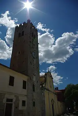 In the 10th and 11th centuries it belonged to the bishop of Poreč. From 1278 it was taken over by Venice and surrounded by solid walls which are still intact today, and used as a walkway with unique views over the four corners of Istria. The three parts of the town are connected by a system of internal and external fortifications with towers and city gates containing elements of Romanesque, Gothic and Renaissance styles, built between the 14th and 17th centuries. It is a typical example of Venetian colonial architecture.[6]