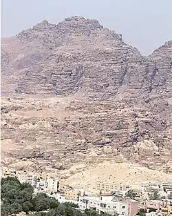 Based on the writing of Josephus,[1] it has customarily been identified with the Jebel Nebi Harun ("Mountain of the Prophet Aaron" in Arabic) or simply Jebel Harun, a twin-peaked mountain 4780 feet above sea-level in the Edomite Mountains on the east side of the Arabah section of the Jordan Rift Valley, not far from Petra. On the summit is a mosque from the Mamluk period, traditionally marking the so-called "Tomb of Aaron" and built over the remains of a Byzantine church,[2] and in the saddle west of it are the remains of a Byzantine monastery dedicated to Aaron.[3] A memorial church built there in the 5th century became the nucleus of a monastic-pilgrimage centre, referred to in a document from among the Petra Papyri dated to 573, as "the House of our Lord the Saint High-Priest Aaron" outside Petra.[3][4]
