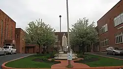 For two years, from 1948 to 1950, work was done on the new building connected to the rectory by the arch. The three-story building was made of flexicore slab and the outside was made from a mixture of new and old bricks in the back and Michigan red sandstone in the front, so that the building was the same color as the buildings to which it was adjoined. The interior of the building was plastered by one of the best plasterers in the area, Dom Graziano, who was the son of a parishioner. He did all of the plastering for free.[46]